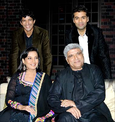 Ils sont pris en photo ci-dessous pour l’émission Koffee with Karan, avec le réalisateur Karan Johar, et le fils de Javed, Farhan Akhtar.